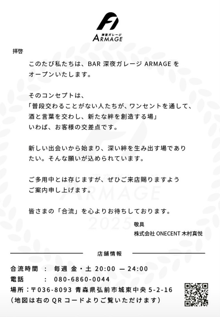 2026.02.27 -[お知らせ] 深夜ガレージARMAGEオープンのお知らせ この度、当社ONECENTではお客様専用のBAR『深夜ガレージARMAGE』をオープン致しました🙇 毎週金・土の20:00〜24:00までの営業です。ご来店の際はお手数ですが一度ご連絡をお願いいたします🙇♂️ 車好きが語らえる場であれたら嬉しいです😊ご来店心よりお待ちしております✨